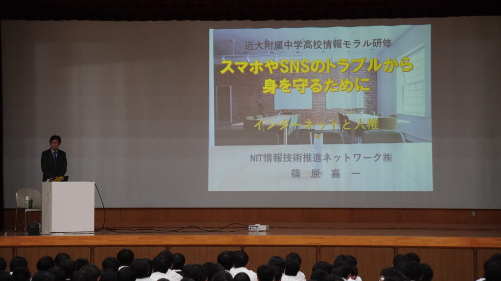 NIT(エヌアイティ)情報技術ネットワーク株式会社代表取締役 篠原 嘉一 さんにご講演いただきました。実際に生徒自身が自分のスマートフォンを使って、SNSの正しい使い方や、設定について学びました。