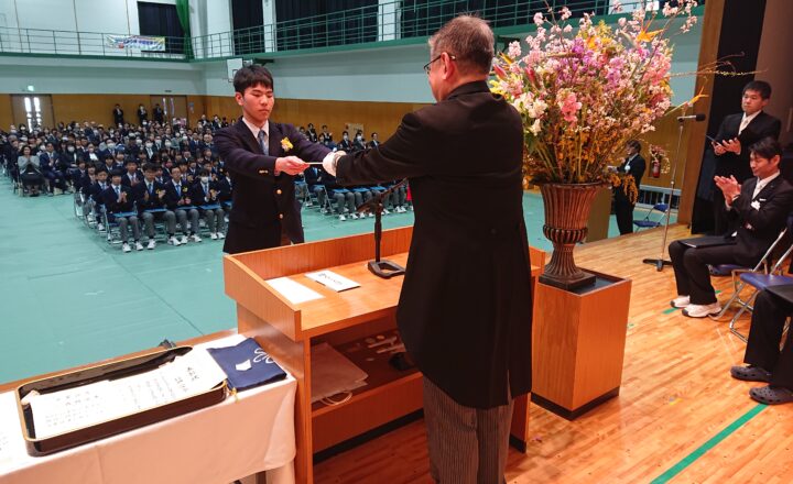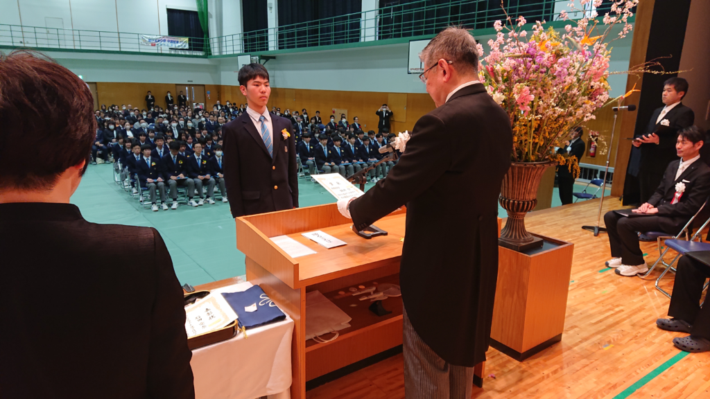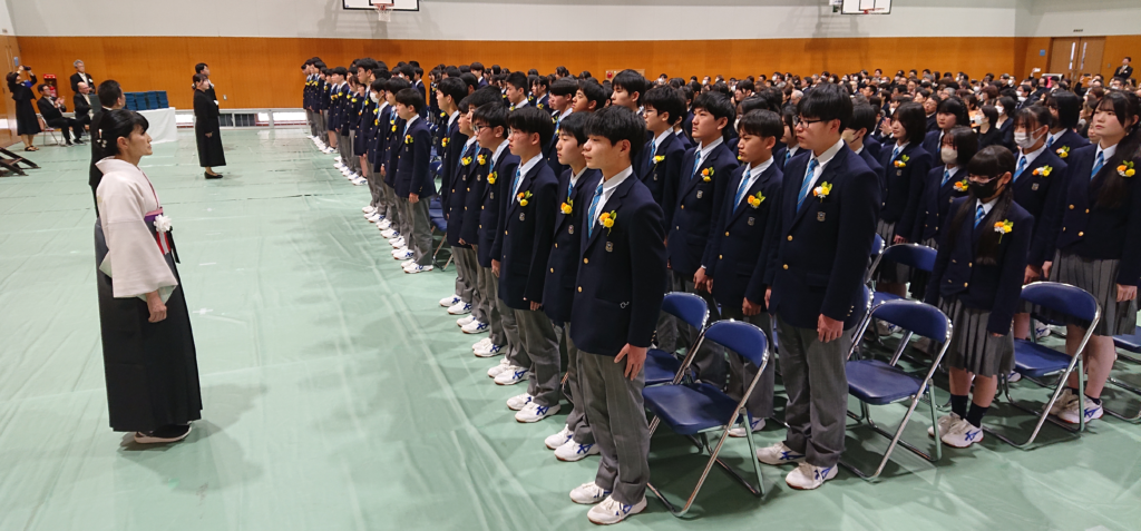 さあ、今日はみなさんの新しい「高等学校」というステージへのレベルアップの第一歩です。校訓にある「人に愛される人、信頼される人、尊敬される人」になるように、みなさんそれぞれが個性を活かしながら、自信と誇りを持ち、4月からは高校生として頑張ってくれることを期待しています。