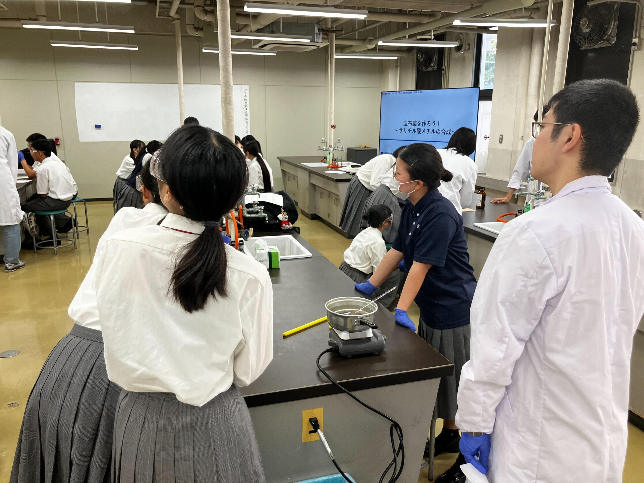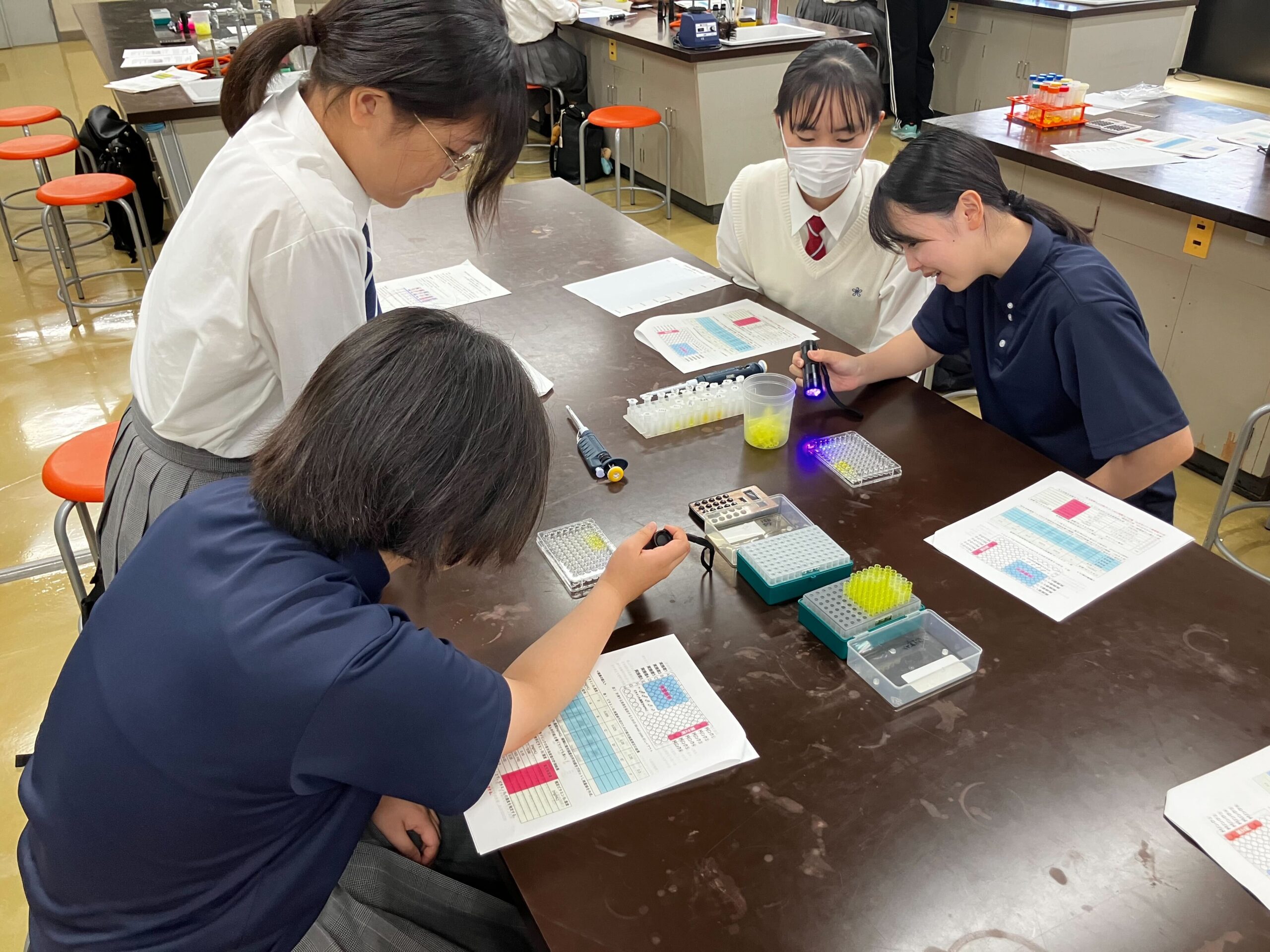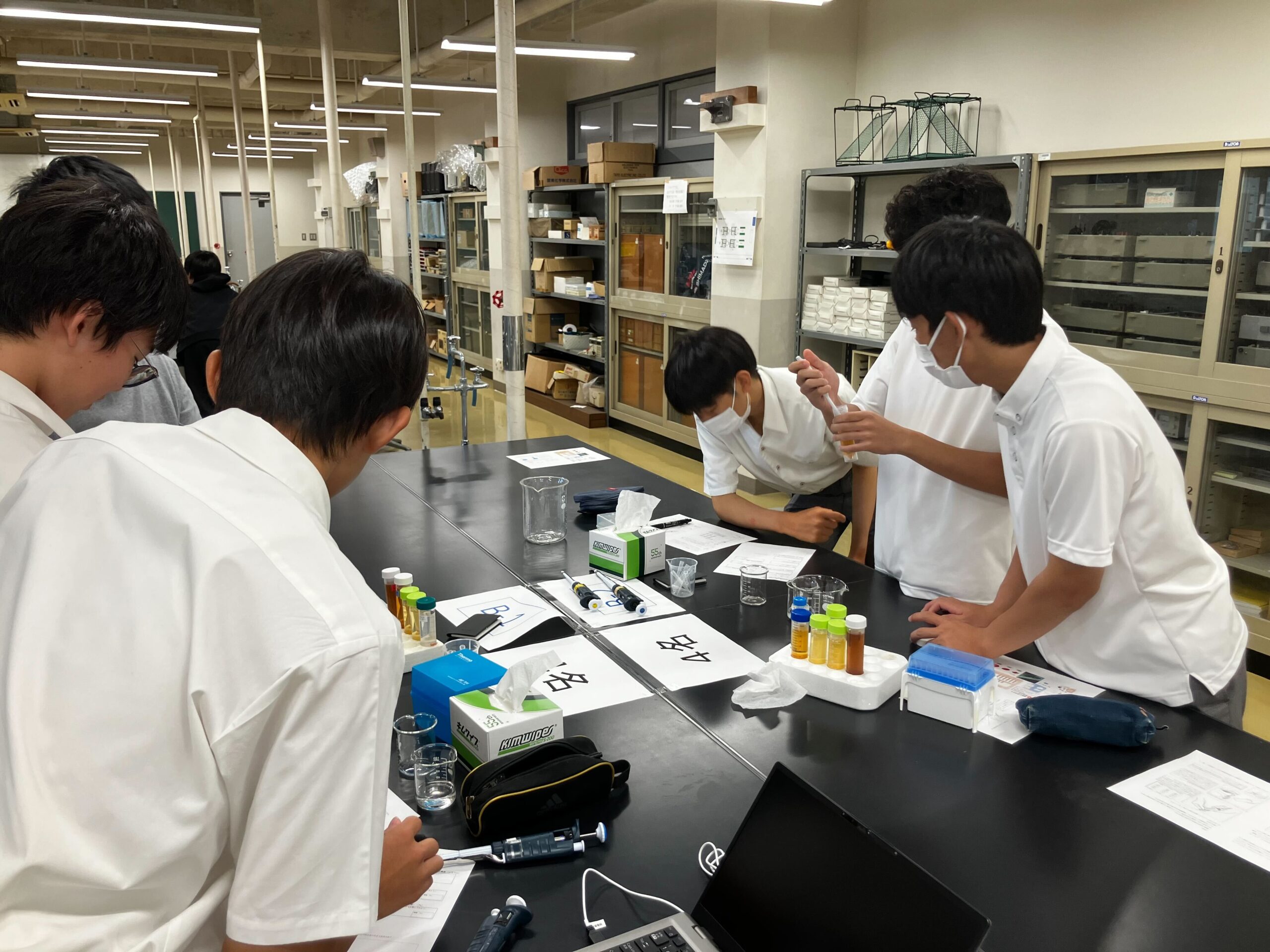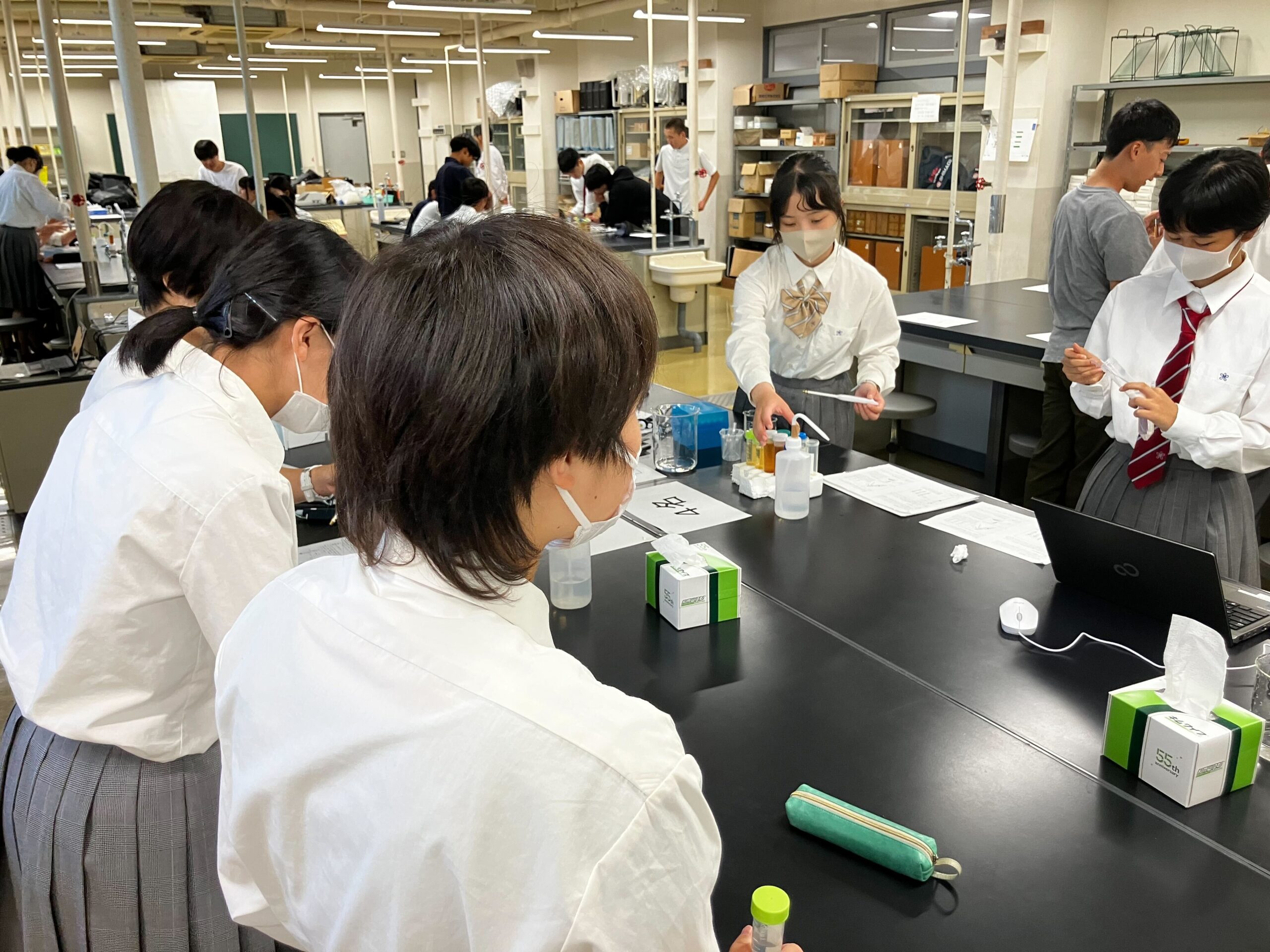 今月6日には、1年生全員で化学生命工学科の先生の実験教室に参加させていただき、グループワークに取り組みました。