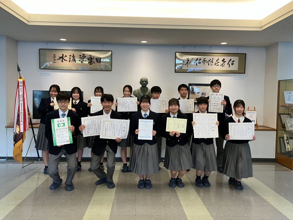 2学期の終業式後、11月以降で各団体より表彰をうけた中学生・高校生の賞状伝達が行われました。ダンス、剣道、卓球、文芸、発明くふう展などさまざまな分野で近校生が自分の才能を発揮してくれています。おめでとうございました。